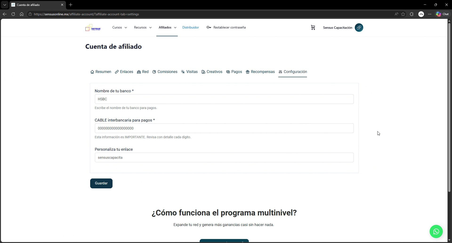 - Ve a la página de Cuenta de afiliado. Después en la pestaña Configuración.