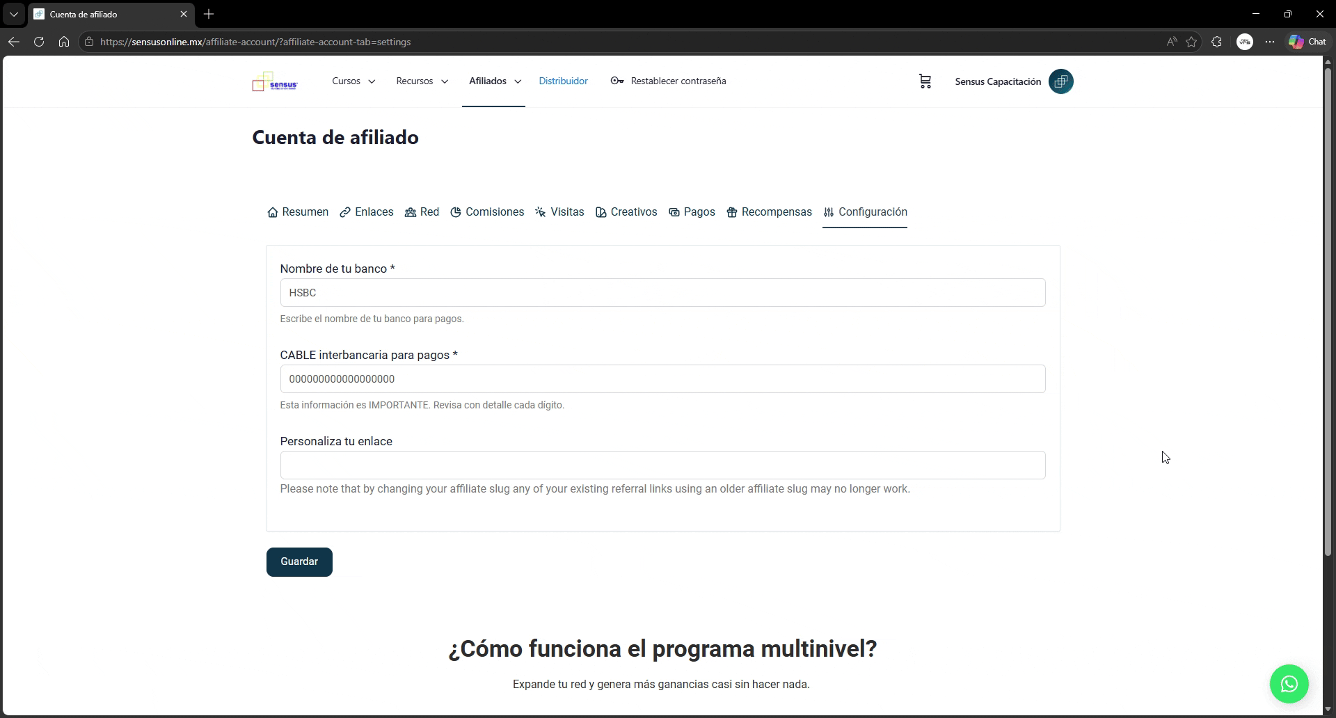Si decides cambiar tu enlace, toma en cuenta que se perderán las vinculaciones que hayas hecho con tu enlace anterior y no podrás comisionar esos cursos.